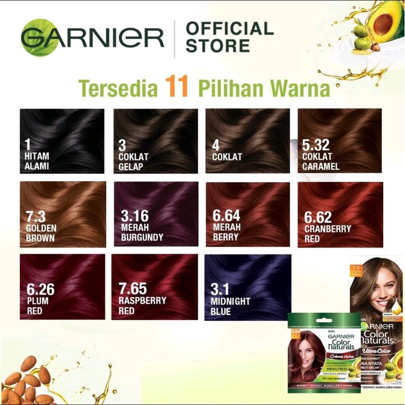 Pewarna rambut dari GARNIER yang akan menghasilkan warna yang tahan lama dan warna natural, pewarna ini juga sangat aman karena terdapat kandungan olive oil yang baik untuk rambut dan tidak akan merusak rambut. Produk pewarna rambut dengan minyak zaitun alami, yang menutup uban dengan sempurna, tahan lama, warna tampak lebih berkilau, sekaligus merawat dan melindungi rambut