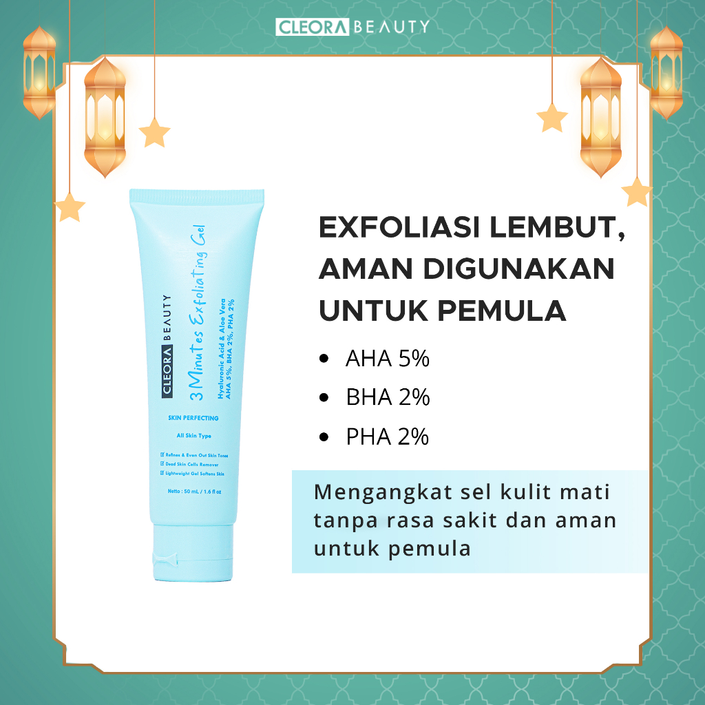 3 Minutes Exfoliating Gel diformulasikan dengan AHA, BHA, dan PHA dengan manfaat mengangkat sel-sel
